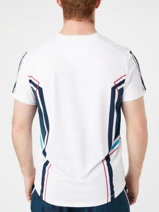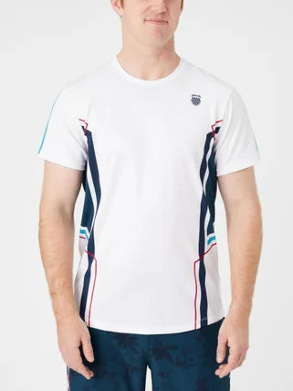 Chase down shots in energized style with the KSwiss New Era Crew. This sporty crew has colorful printed stripes, a KSwiss shield logo on the left chest, a breathable mesh-like fabric and a shaped hem with longer length back for added coverage. The 4-way stretch material has moisture wicking technology to keep you cool, dry and focused on the court.